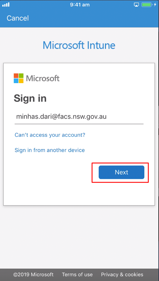 | Step (2) On the Microsoft Intune Sign In screen; in the Username field, enter your DCJ email address in the format below and tap 'Next' For e.g.Firstname.Lastname@facs.nsw.gov.au