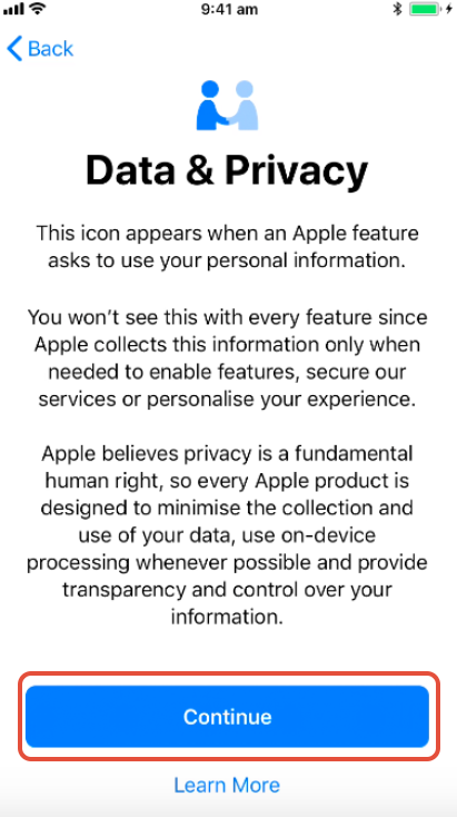 | Step (6) On the Data & Privacy screen, tap on ‘Continue’