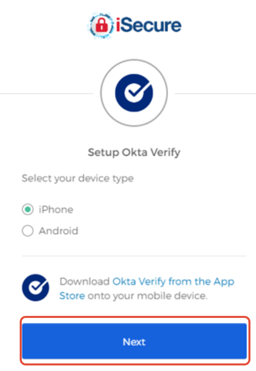 Step (7) Click on setup.![]() | Step (8) Select your type of phone. DCJ issued mobile phones are iPhones, so click on iPhone and then click next.![]() | Step (9) Open the Okta Verify App on your iPhone. If you can't find it download it from the Apple App Store.![]() |