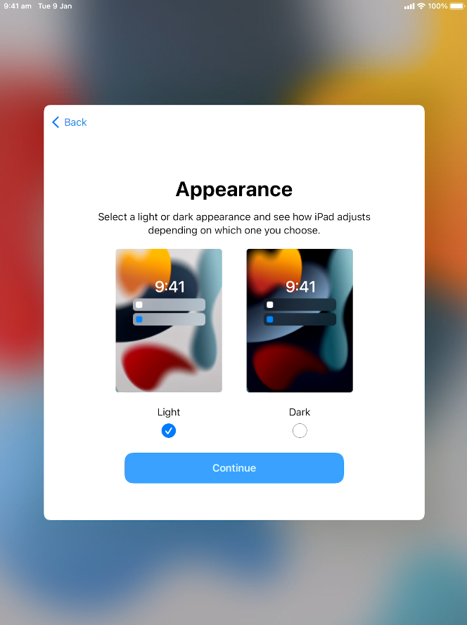 Step (16) On Appearance screen, select either the Light or Dark display option depending on your preference and click "Continue".